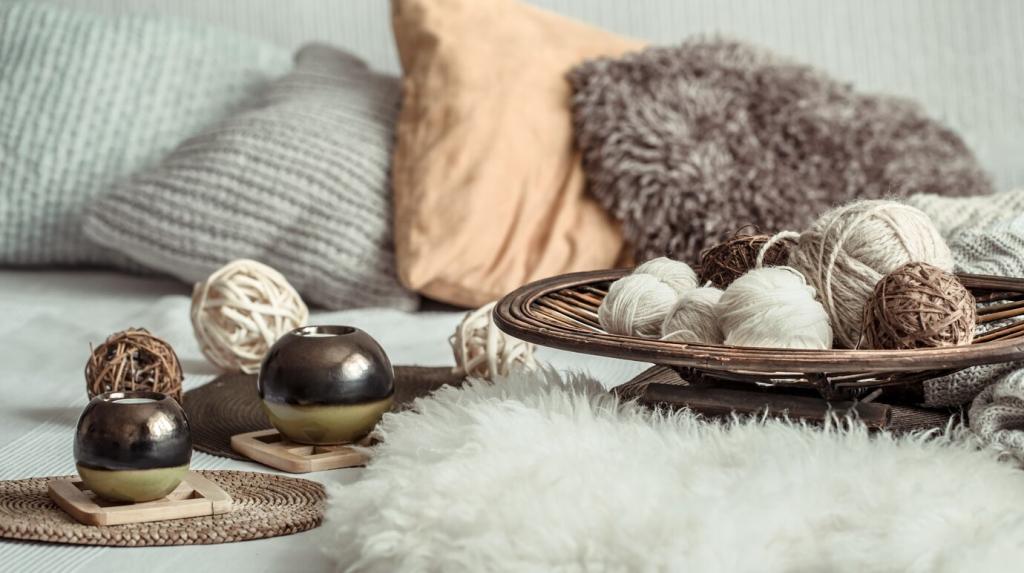 Wähle gedeckte Töne wie Salbeigrün, Sandbeige und Nebelblau, denn niedrige Sättigung senkt visuelle Spannung und unterstützt ruhige Momente. Viele berichten, dass solche Paletten ihre Abendroutine erleichtern. Welche sanften Farbtöne beruhigen dich spürbar? Teile es gern mit uns.